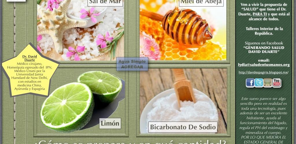 Si te gusta tomar agua de sabores de fruta puedes hacerlo y agregarle un poco de bicarbonato pero lo ideal es tomar sólo el SUERO. La receta del suero es con LIMÓN. Este suero parece ser algo sencillo pero en realidad es toda una tecnología pues además de ser un excelente hidratante, ayuda al funcionamiento del hígado, regula el PH del estómago y mineraliza el cuerpo POR LO QUE MEJORA EL ESTADO GENERAL DE SALUD. Este suero NO tiene contraindicación alguna, todos pueden tomarlo y obtendrán buenos resultados para su salud. A veces provoca «crisis curativa», es decir, algunos síntomas molestos, hay que tener paciencia y seguir tomándolo. Puedes tomar agua de frutas con una pizquita de bicarbonato o sueros comerciales si te es necesario pero de preferencia la idea es que mejor tomes el suero sobre todo en vez de agua sola.