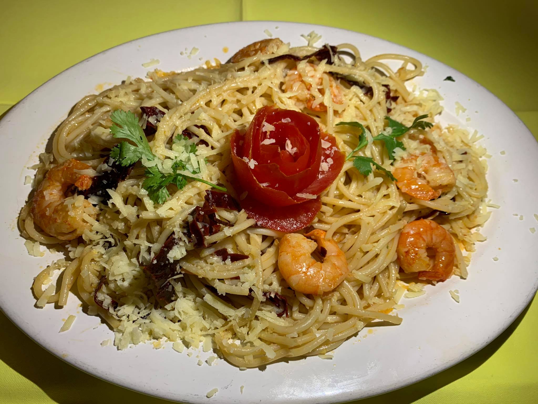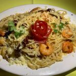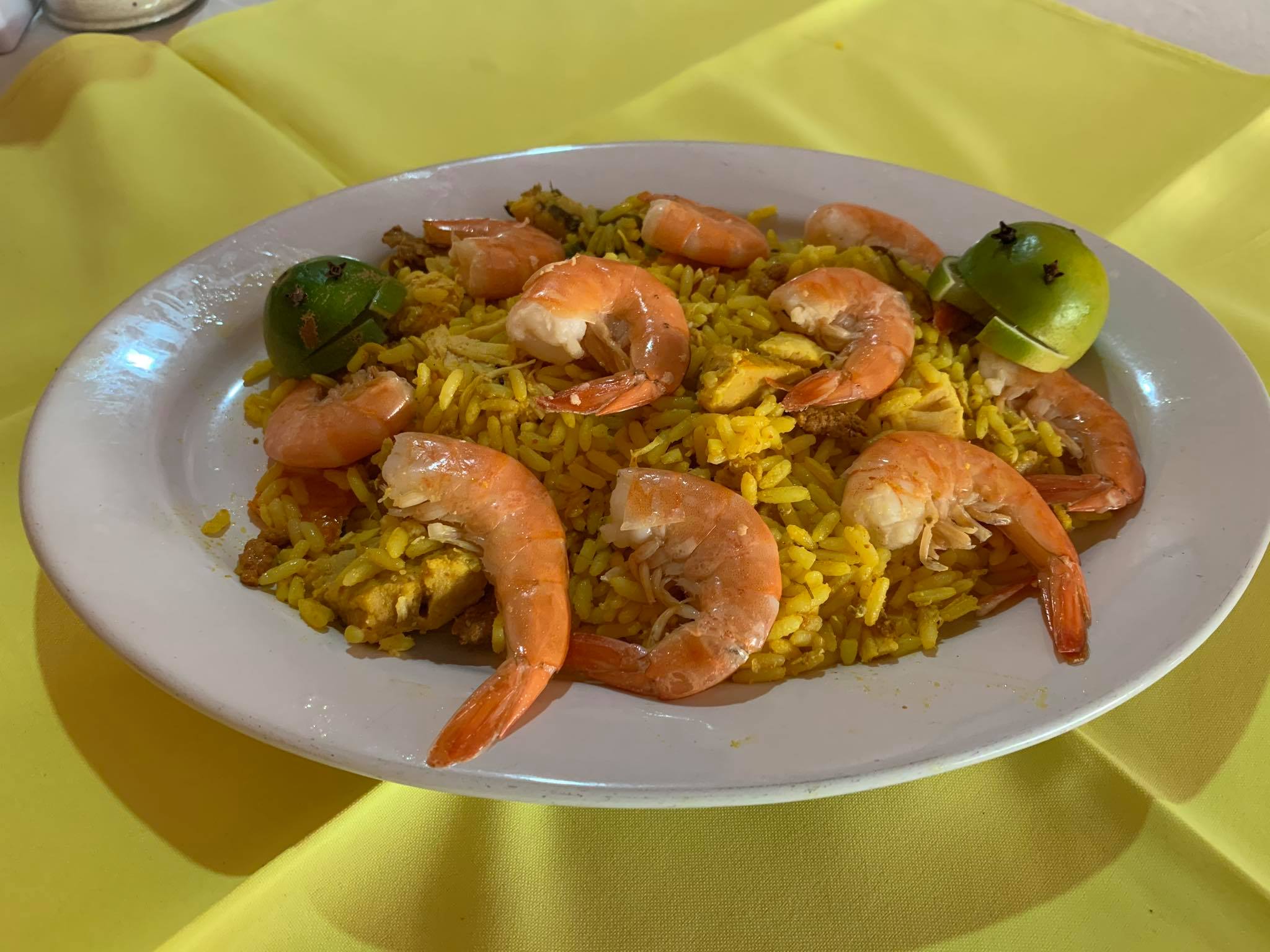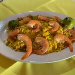(Camarón, pollo, cerdo, tocino, chorizo, ajo, cebolla, pimiento morrón, cúrcuma, arroz precocido y fondo de pescado). Se sirve todos los sábados.