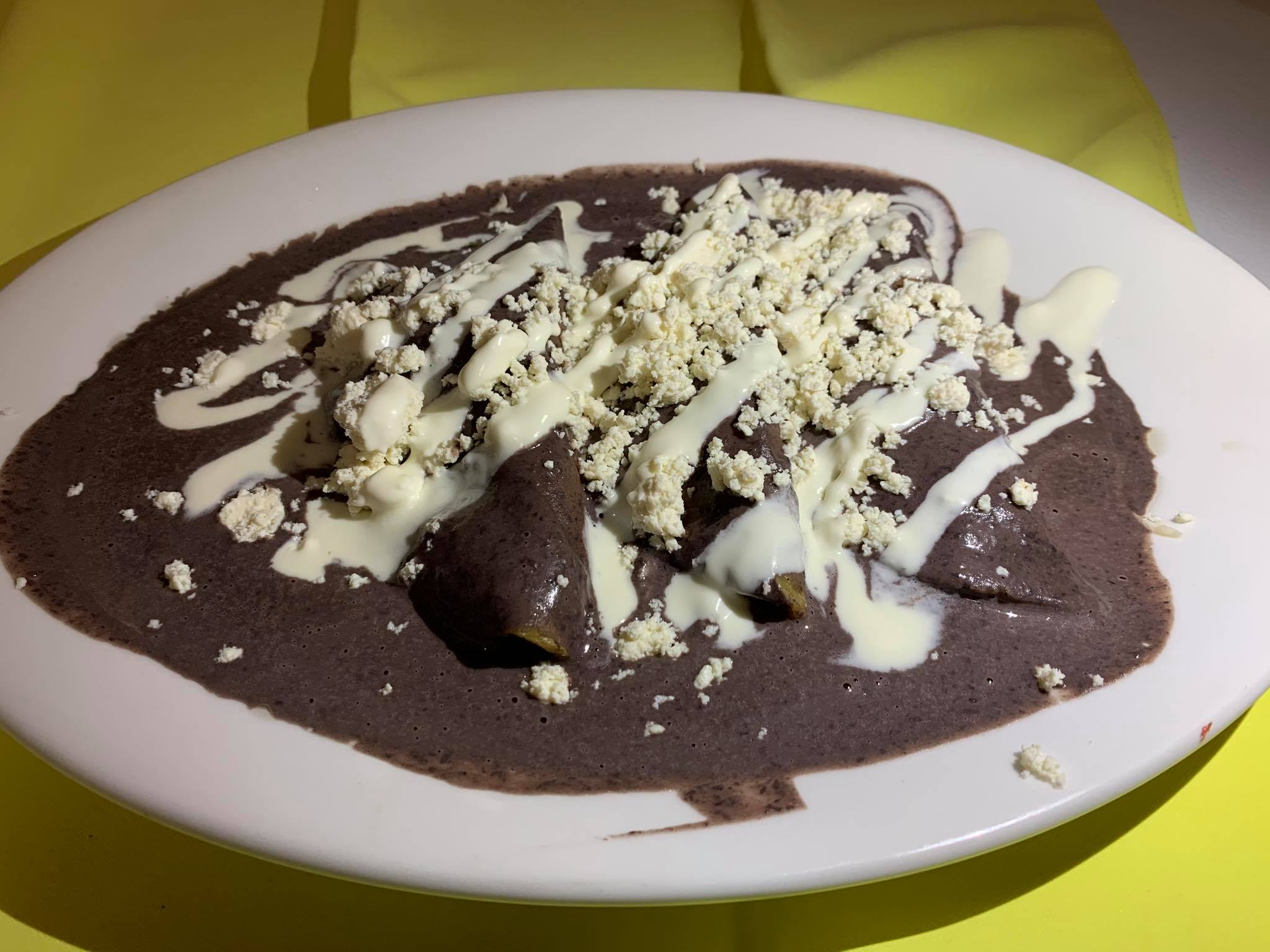 (Tres piezas rellenas de queso, huevo ó pollo, bañadas con salsa de fríjol, queso mozarela, crema y cebolla)