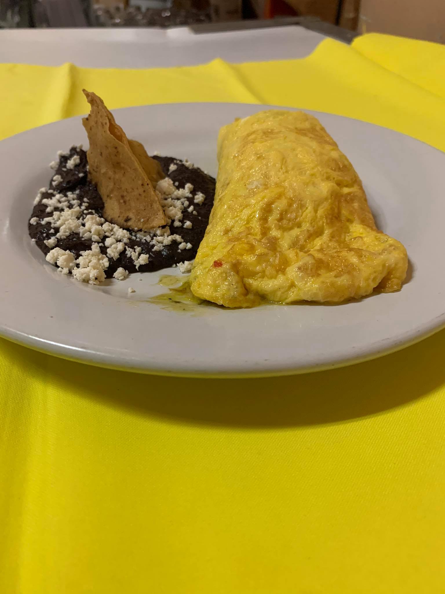 (Tortilla de huevo con huitlacoche, grano de elote, rajas poblanas, epazote y cebolla.)