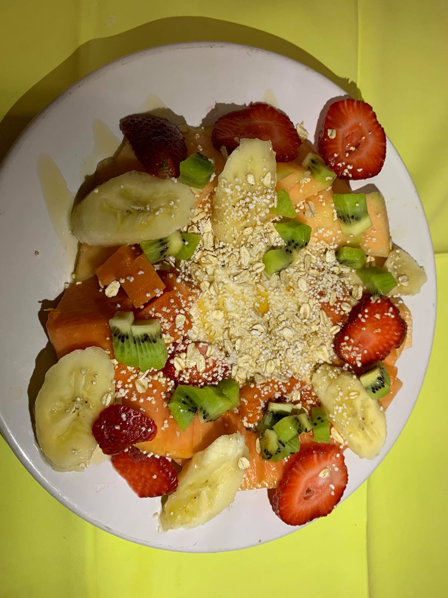 (Tres frutas de temporada, melón, papaya, fresa, yogurt, granola y miel)